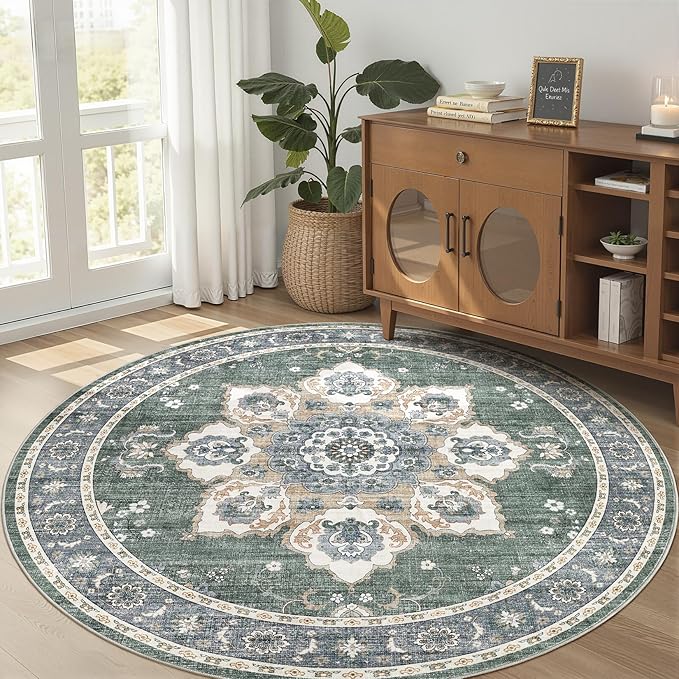 Area Rug for Living Room - 5x5 Soft Washable Oriental Vintage Floral Distressed Large Carpet - Fade Stain Resistant Non Slip Rugs for Bedroom Dining Room Nursery Dorm Office Home Decor - Green