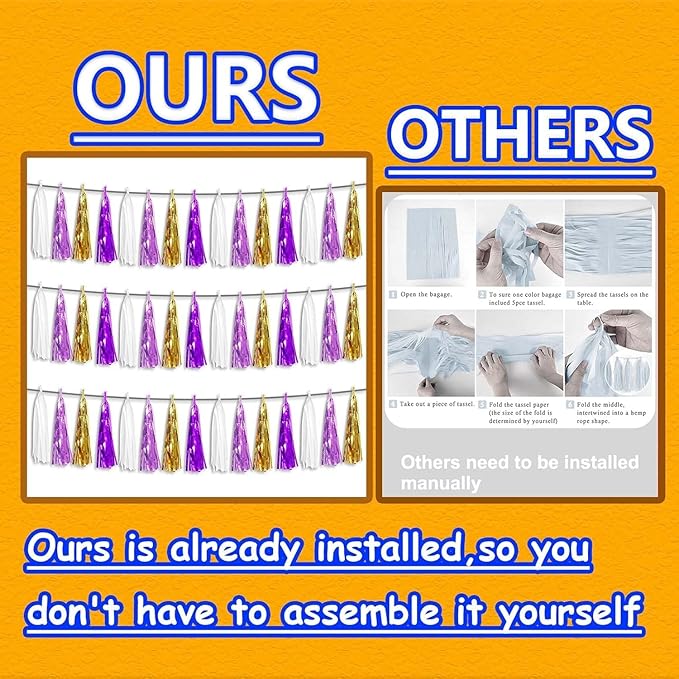 - 【Package Includes】The total length of them Purple Gold birthday tassels banner is 30 feet, divided into 3 strips, each 10 feet long. Each banner contains 15 tassels, and each tassel measures 14 inches, for birthday decorations many occasions uitable for Patriotic display, Homecoming Float, Christmas Float, ecorative metal trailers, graduation floats etc