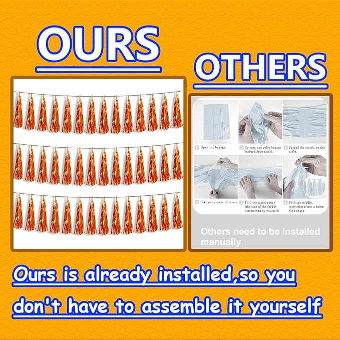 - 【Package Includes】The total length of the orange birthday tassels banner is 30 feet, divided into 3 strips, each 10 feet long. Each banner contains 15 tassels, and each tassel measures 14 inches, for birthday decorations many occasions uitable for Patriotic display, Homecoming Float, Christmas Float, ecorative metal trailers, graduation floats etc