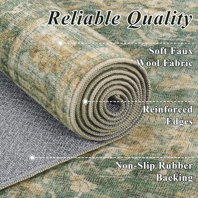 HelloTree Washable Rugs 9x12 Area Rug for Living Room, Vintage Boho Green Rug Non Slip Carpet Retro Accent Indoor Mat Print Distressed Low Pile Throw Large Rug for Office Dining Room Bedside-Green