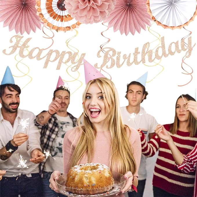 - 【Package Content】 Blush pink rose gold fall birthday party decorations contains: 1 pcs happy birthday streamers garland banner sign, 1 pcs circle dots paper banner, 3 pcs hanging paper lanterns, 4 pcs tissue paper pom poms, 2 pcs honeycomb balls, 4 pcs paper fans, 6 paper swirls, total 21 pcs in 8 12 16 inch and blush pink rose gold peach color.