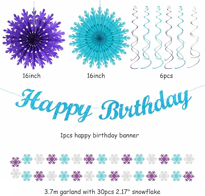- 【Bue Purple Teal Party Favors】This kits include 1pcs happy birthday banner, 1pcs snowflake paper banner, 4pcs tissue pom poms: 3pcs 10" and 1pcs 12" , 3pcs 8inch paper honeycom ball, 2pcs 8inch paper lantern, 4pcs 12inch paper flower fan, 6pcs Paper swirls hanging streamers.