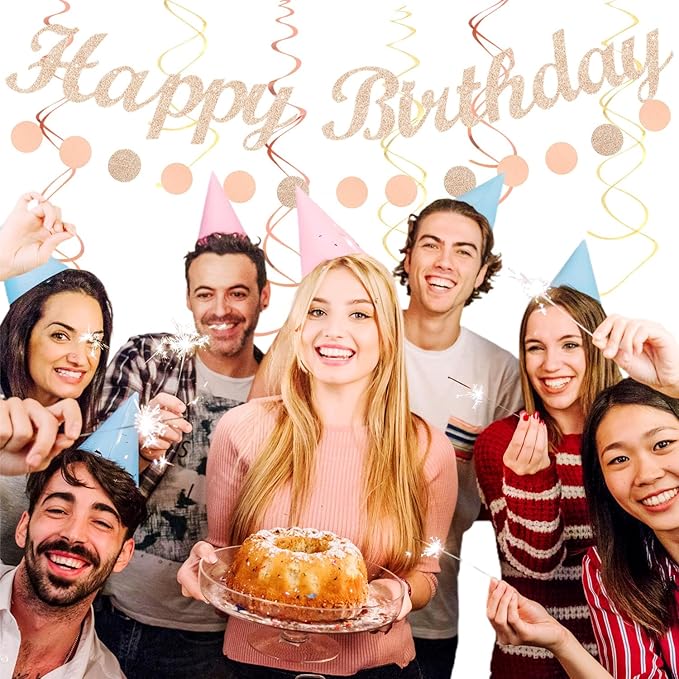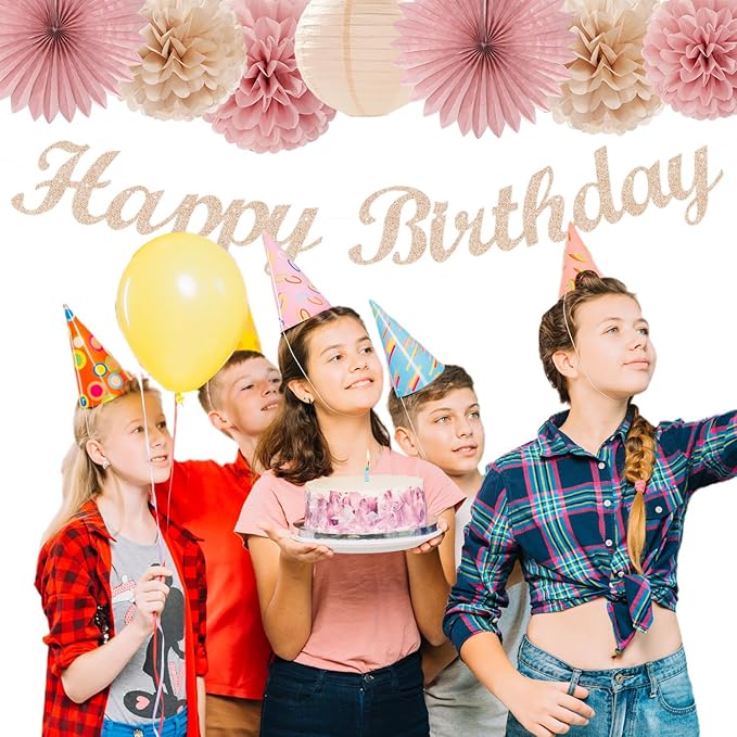 - Package Includes: This kits include 1pcs happy birthday banner, 1pcs circle dots paper banner, paper tassels party garland, 4pcs tissue pom poms flowers, 2pcs paper lanterns, 2pcs paper flower fans, 6pcs paper swirls hanging streamers in blush pink champagne beige rose gold colors, and different sizes