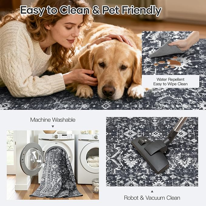 - Machine Washable Rug: This low-pile area rug resists pet hair and debris and is easy to clean—simply vacuum, sweep, or wipe between machine washes, saving you time and effort. Care Tips: Cold gentle cycle. Mild detergent only. Tumble dry low or air dry