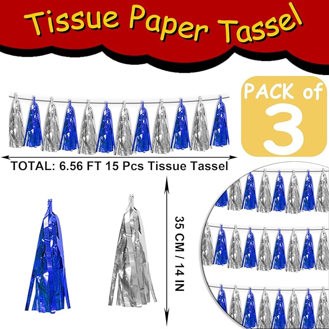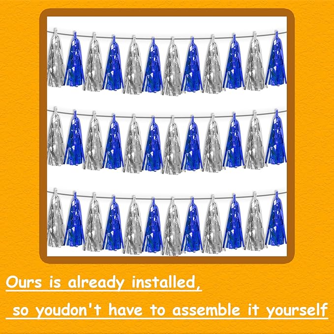 - 【Package Includes】The total length of the Navy-Blue Silver birthday tassels banner is 30 feet, divided into 3 strips, each 10 feet long. Each banner contains 15 tassels, and each tassel measures 14 inches, for birthday decorations many occasions uitable for Patriotic display, Homecoming Float, Christmas Float, ecorative metal trailers, graduation floats etc