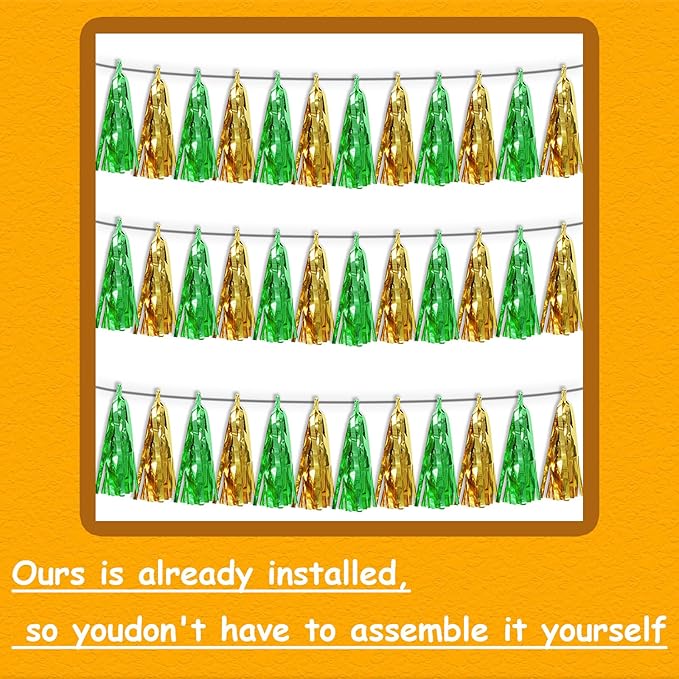 - 【Package Includes】The total length of the green gold birthday tassels banner is 30 feet, divided into 3 strips, each 10 feet long. Each banner contains 15 tassels, and each tassel measures 14 inches, for birthday decorations many occasions uitable for Patriotic display, Homecoming Float, Christmas Float, ecorative metal trailers, graduation floats etc