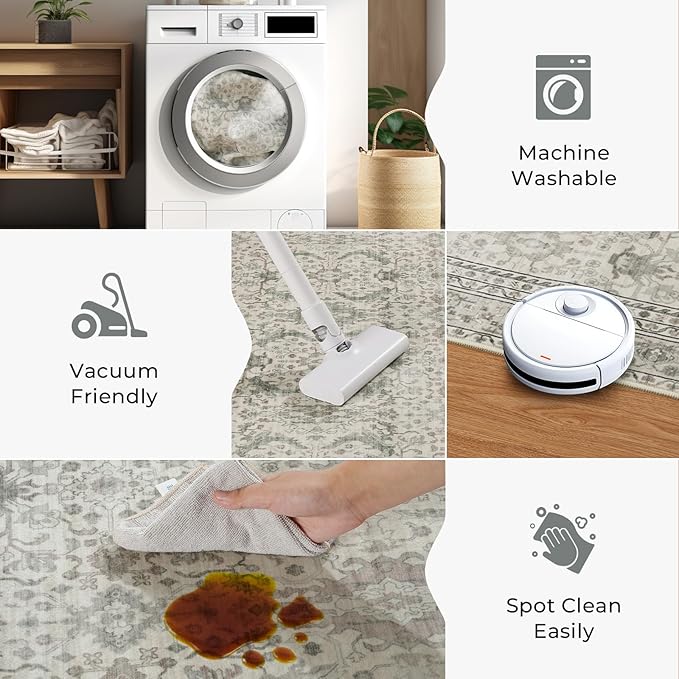- Machine Washable Rug: This low-pile area rug resists pet hair and debris and is easy to clean—simply vacuum, sweep, or wipe between machine washes, saving you time and effort. Care Tips: Cold gentle cycle. Mild detergent only. Tumble dry low or air dry