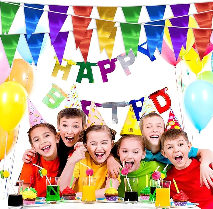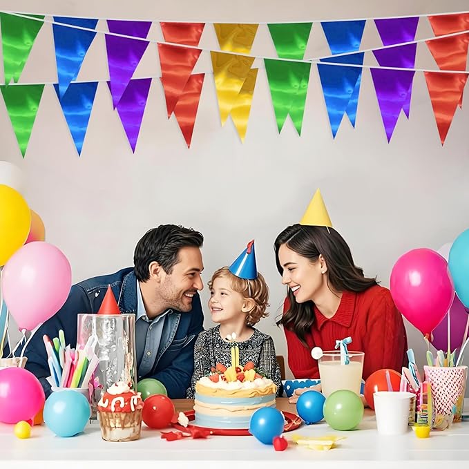 - 【Colorful Pennant Bunting Set】: The total length of the Colorful Triangle banner is 130 feet, divided into4 strips, each 32.8 feet long. Each Pennant Banner 80Flag Size: 7.87''/20cm width x 11.8''/30cm height for birthday decorations many occasions, and so on